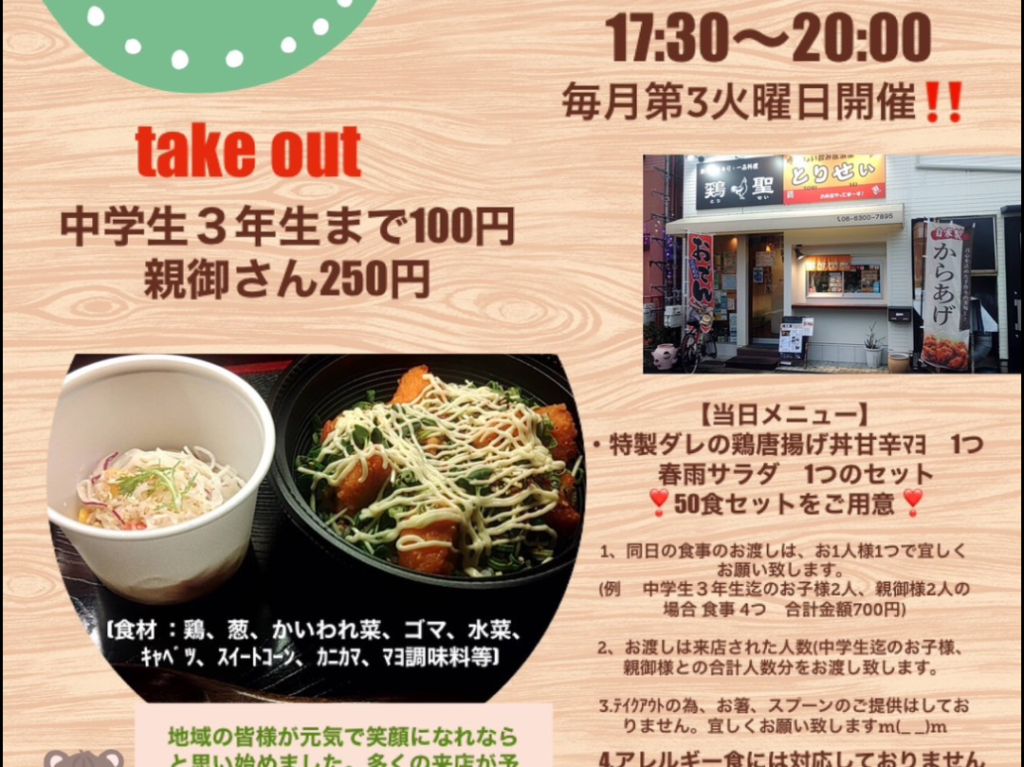 中学3年生までは150円, 親御さんは350円で70食限定のテイクアウト限定となっています。