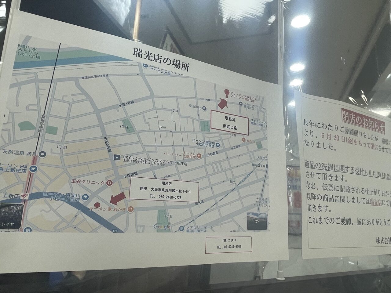 閉店のお知らせの隣には、瑞光店の案内地図も設置されていますので参考になります。特に普段から南江口店をご利用されている方は注意が必要ですね。また、空いた店舗がどのように活用されるのかも、今後注目を集めそうです。