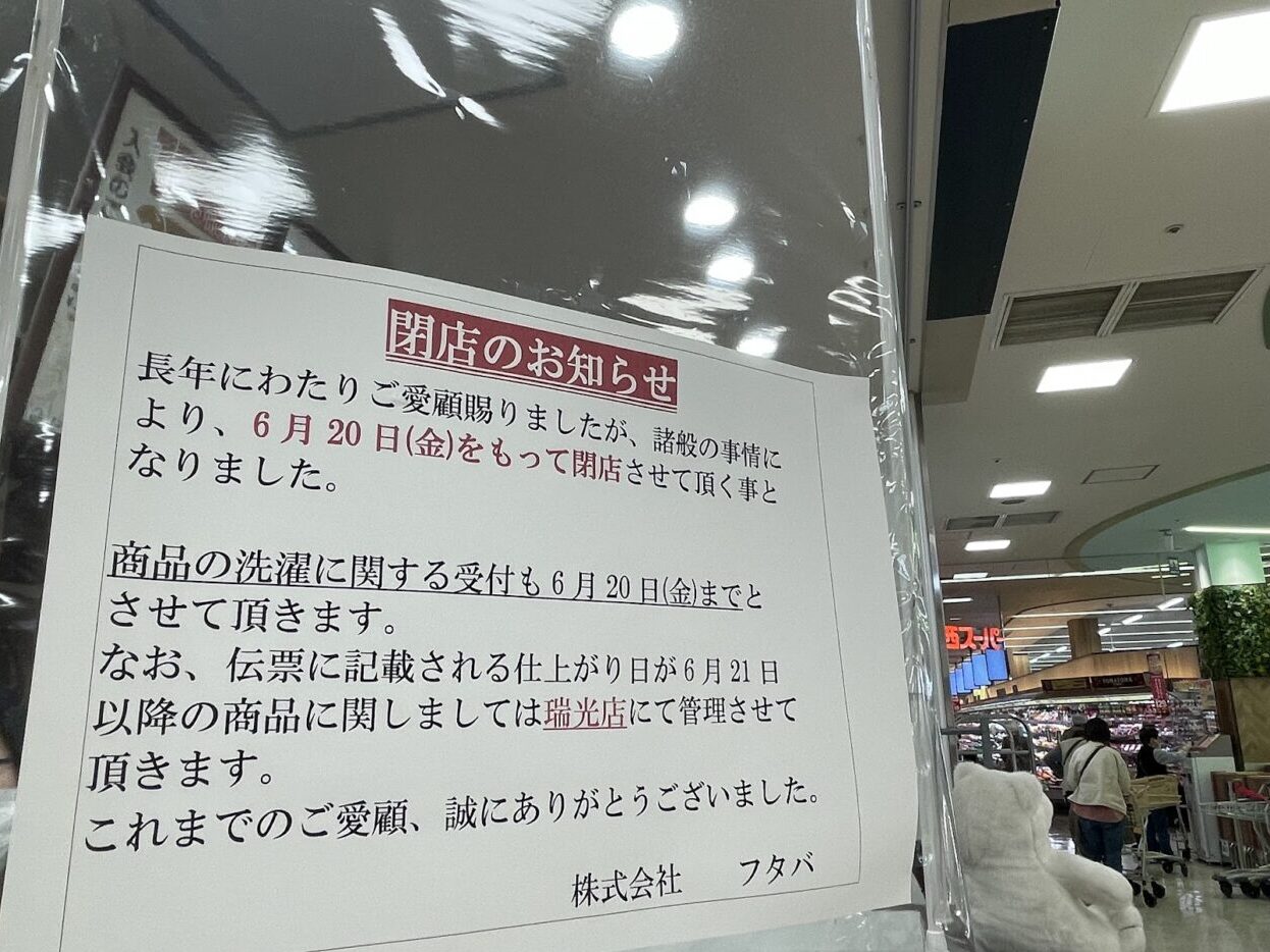 店内にある、クリーニング屋の「ライフクリーナー」 を訪れると、この日は通常営業をしていましたが、張り紙がされていたので近づいて見てみました。ちなみに、店名に「by Nice Corp.」とありますが、2023年の5月には株式会社フタバに全事業を継承しているので運営会社は変わっています。