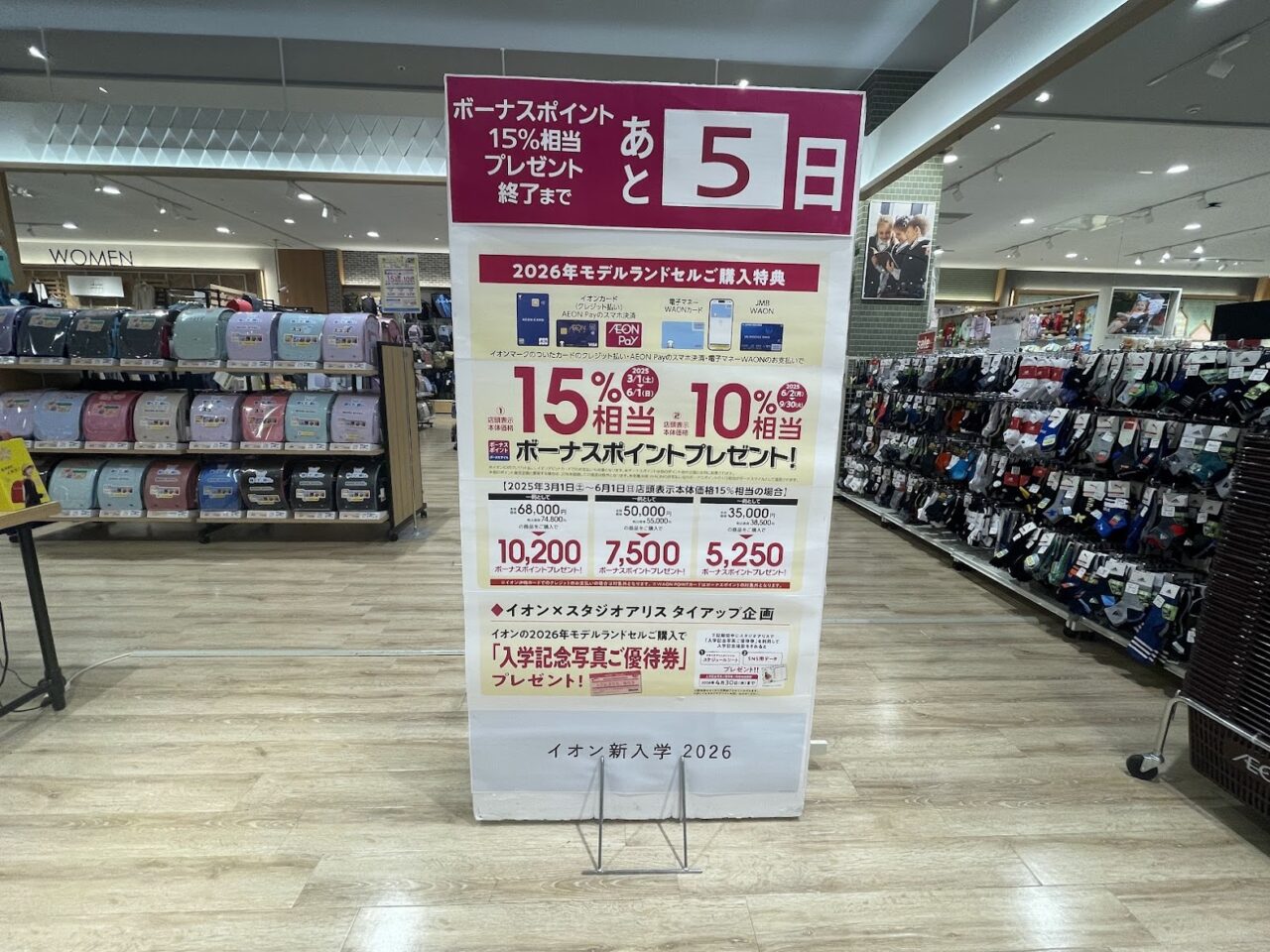 イオンでは現在「ランドセルフェス」を開催中で、イオンスタイル東淀川店では2025年7月18日から21日まで、展示販売会を行うようです。また、このキャンペーンに際して6月1日までは商品価格の15%相当、6月2日から9月30日までは10%相当のポイントプレゼントもあるようです。