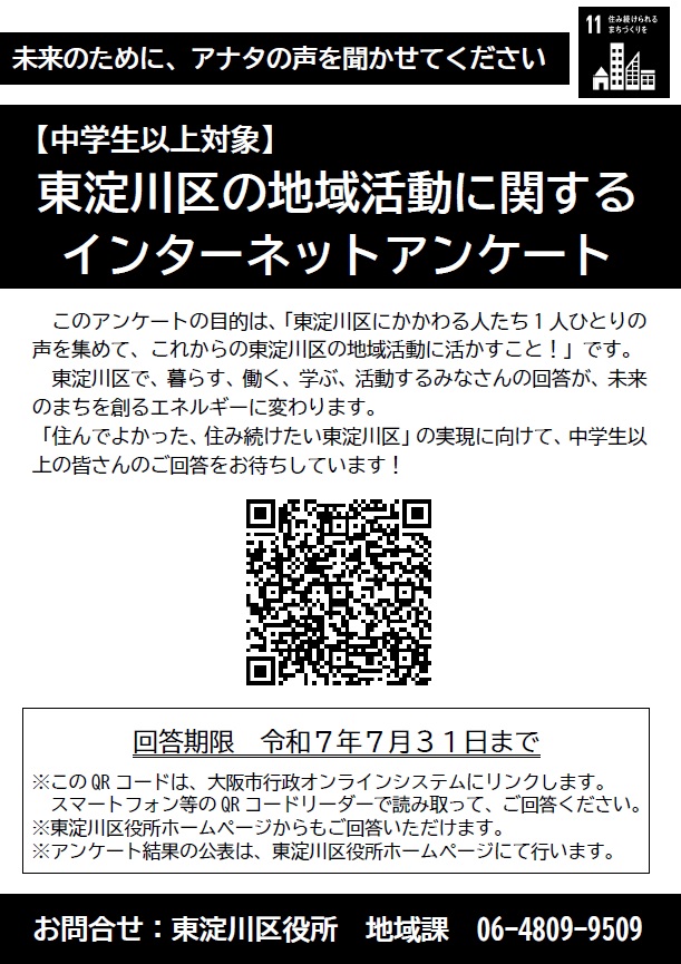東淀川区が、2025年7月31日まで、東淀川区民の皆さんを対象にインターネットアンケートを実施中とのことです。少子高齢社会、価値観・働き方の多様化などにより、地域社会のニーズや課題は大きく変化しようとしている中で、これからの地域活動に生かすことが目的とのことです。東淀川区役所が実施するアンケートの案内画像