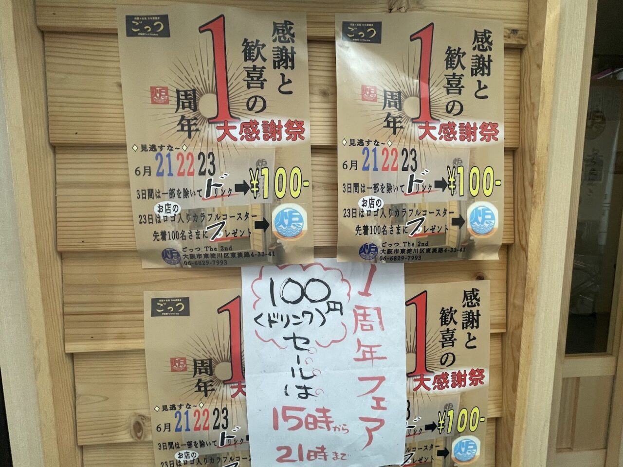 東淡路商店街にある「わら炭焼きごっつ The 2nd」が1周年大感謝祭を実施しています。2025年6月21日(土)から23日(月)の3日間で、一部ドリンクが15時から21時までは110円で飲めるようです!