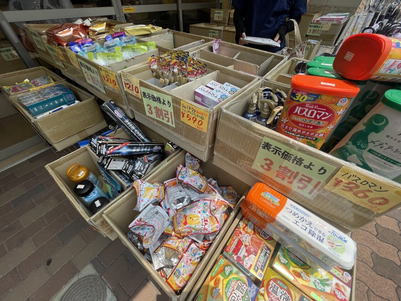 閉店に伴い7月2日(水)から閉店セール中でした。アパレル・パジャマが5割引き、それ以外の商品が3割引きの大特価です。店舗の様子を覗いたところ、屋外には3割引きの日用品がずらっと並んでいました。