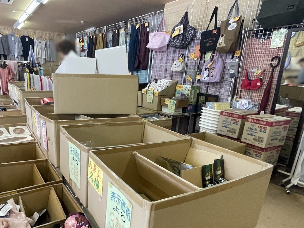 店内にはご婦人向けのアパレル商品が中心に並んでいました。アパレル商品が並ぶ中にも日用品が混ざっていたりしましたので、掘り出し物を探す感覚で、お近くを立ち寄った際は覗いてみても良いかもしれません。