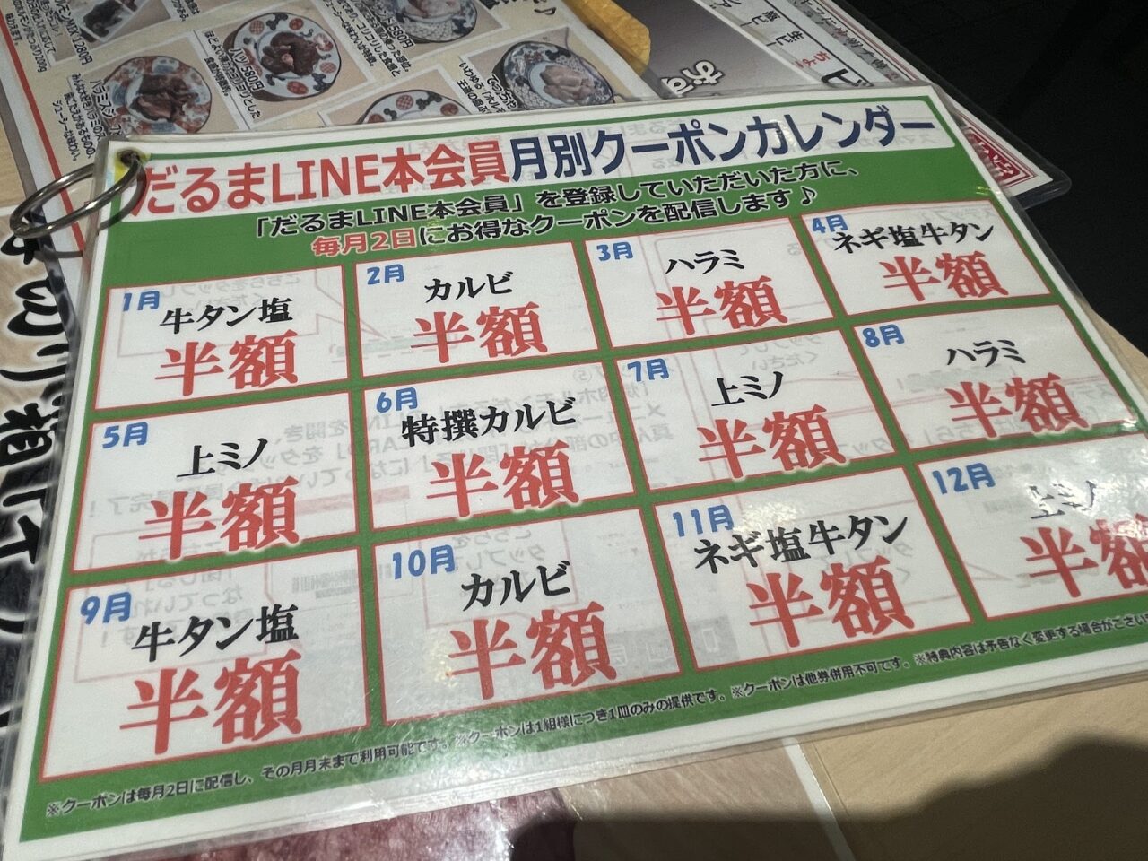 また、月替わりでお得なクーポンも配信されているようです。お肉1種が半額で提供されるクーポンなので、自分が好きなお肉が半額になる月がある場合は特に嬉しいサービスです。