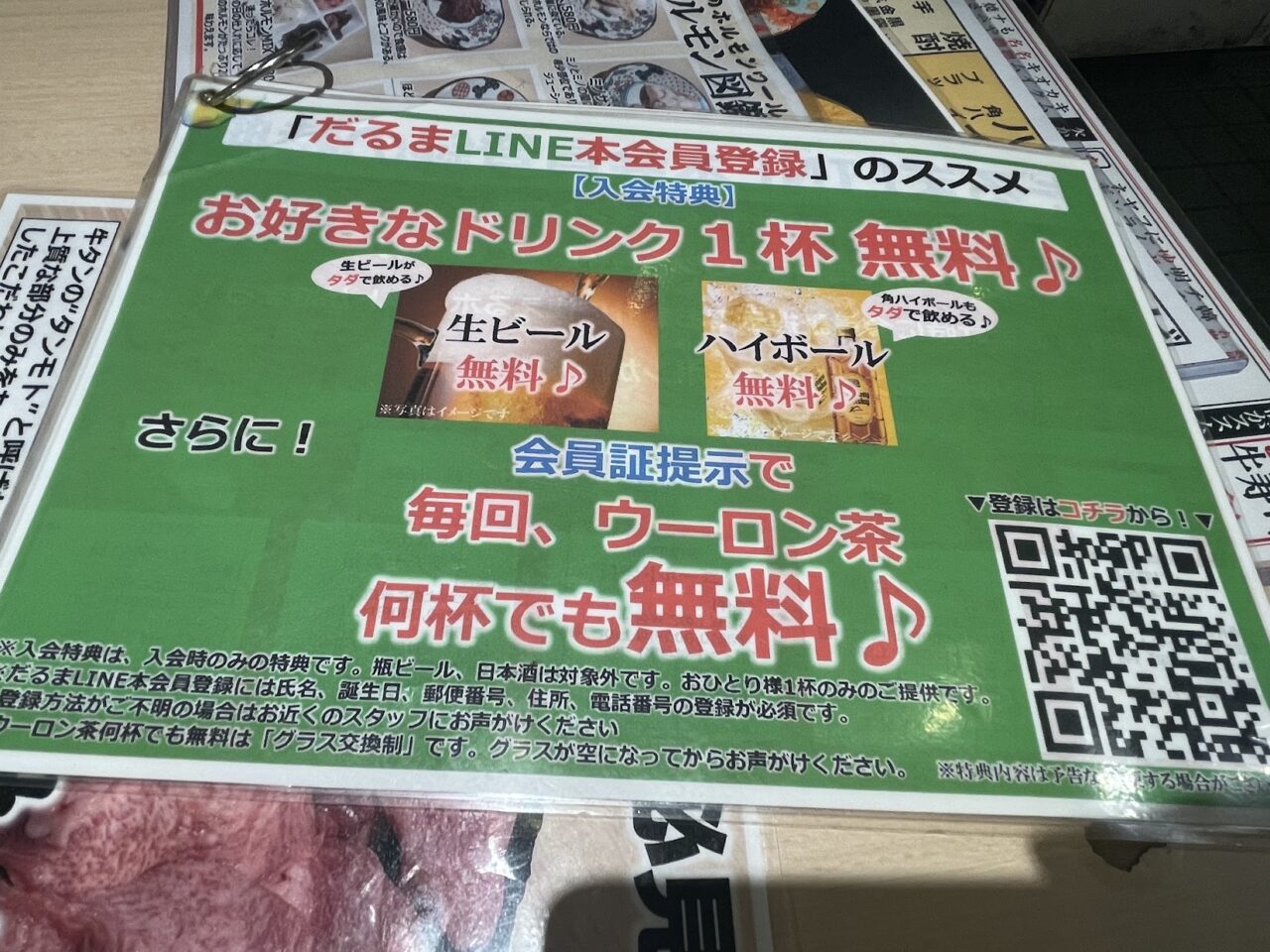 まず店内に入り席に案内されると、卓上に目が入るのがLINEの会員登録。無料で登録ができ、登録特典として好きなドリンクを、なんと1杯無料で飲むことができます。さらに会員証(LINEから表示できる画面)を提示すると毎回、ウーロン茶を無料で飲むことができる嬉しい特典も付いています。