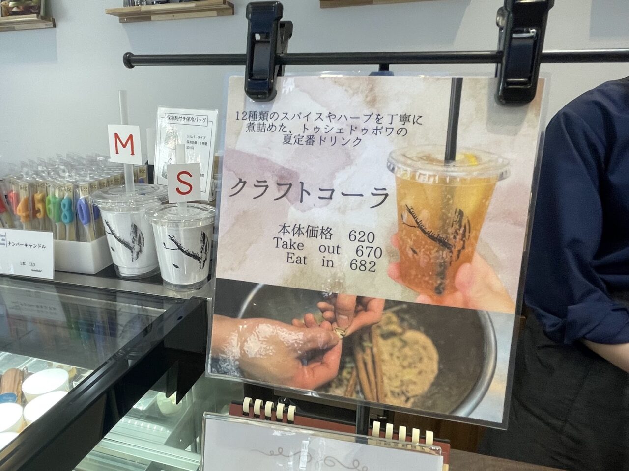 さて、気になる夏季限定商品は何かというと、「クラフトコーラ」でした!洋菓子店なので、ケーキや焼き菓子がメインのイメージがありますが、ドリンクも本格的です。店員さんにお聞きしたところ、クラフトコーラは2025年7月1日から夏季限定(終了未定)で販売開始したとのことです。12種類のスパイスやハーブを使っており、例えばナツメグをホールから削ったり、カルダモンの実を割くひと手間を加えこだわった一品のようです。
