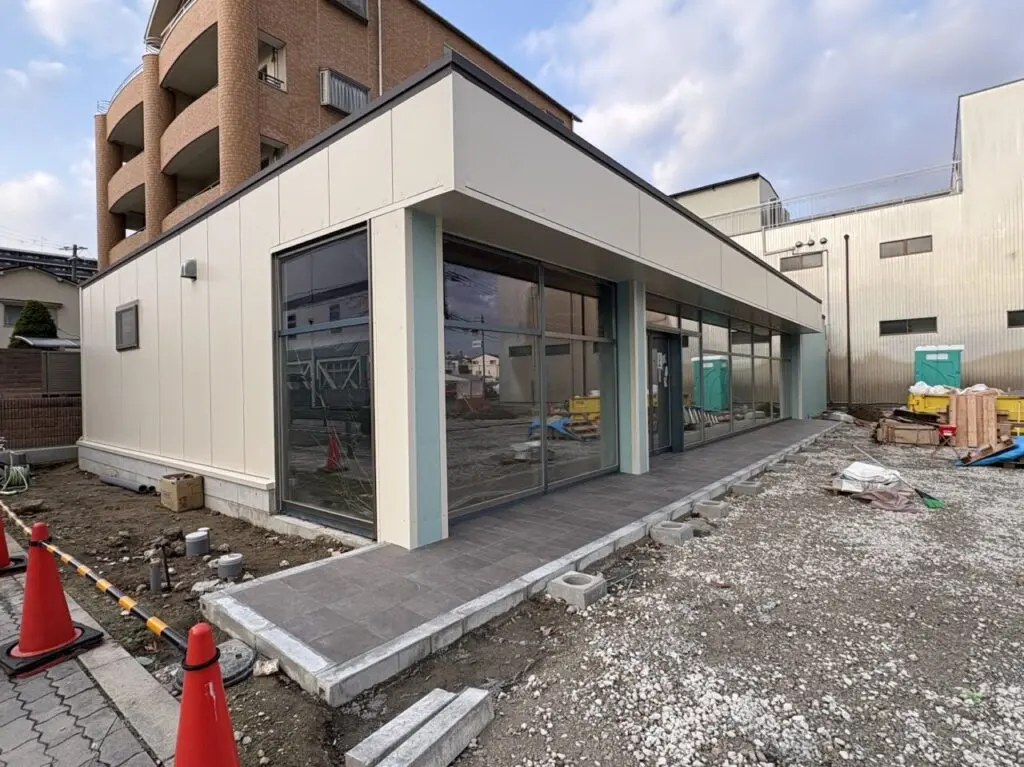 建物に近寄って見るとコンビニでよくみられる形です。調べてみると、セブンイレブンがオープンするようです。公式ページで新規オープンの案内がされていました。コンクリート敷設や内外装の工事はまだこれからといった段階でしたので、オープン予定などの情報が解禁された段階でまたご紹介できればと思います。