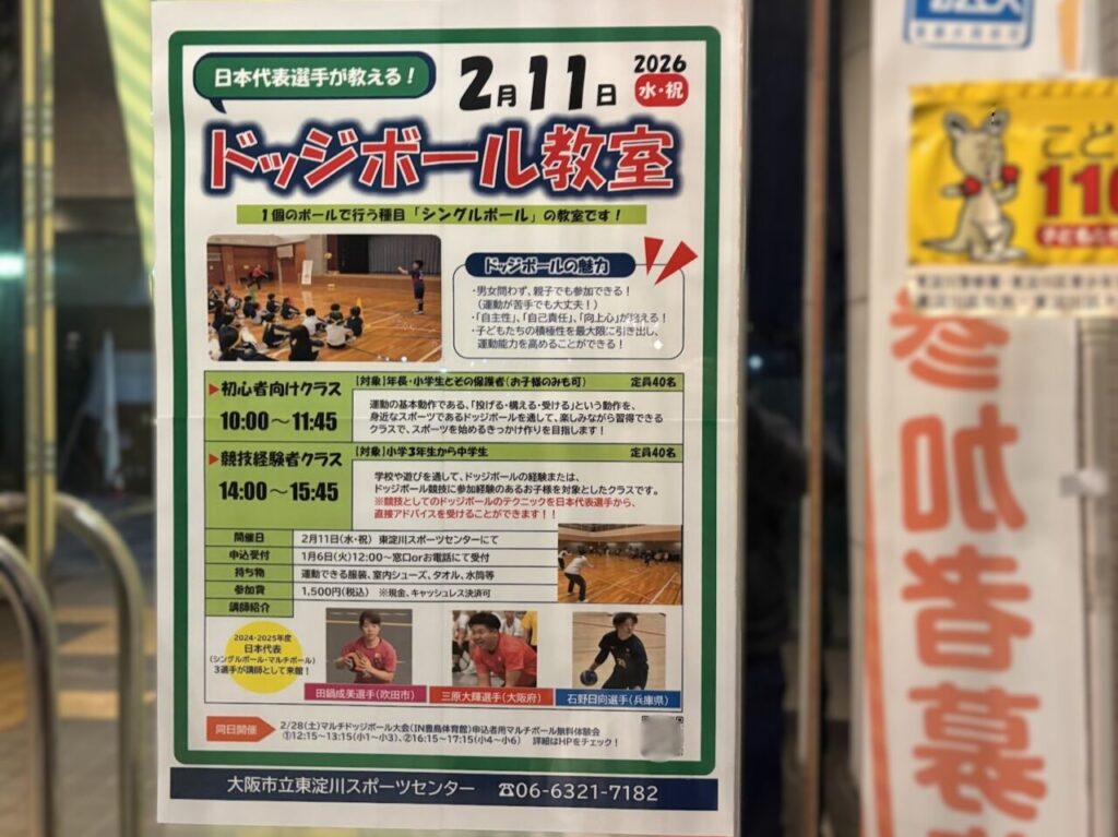 2026年2月11日(水・祝)に、東淀川スポーツセンターにてドッジボール教室が開催されるようです。東淀川スポーツセンターの入り口にチラシが掲示されていました。