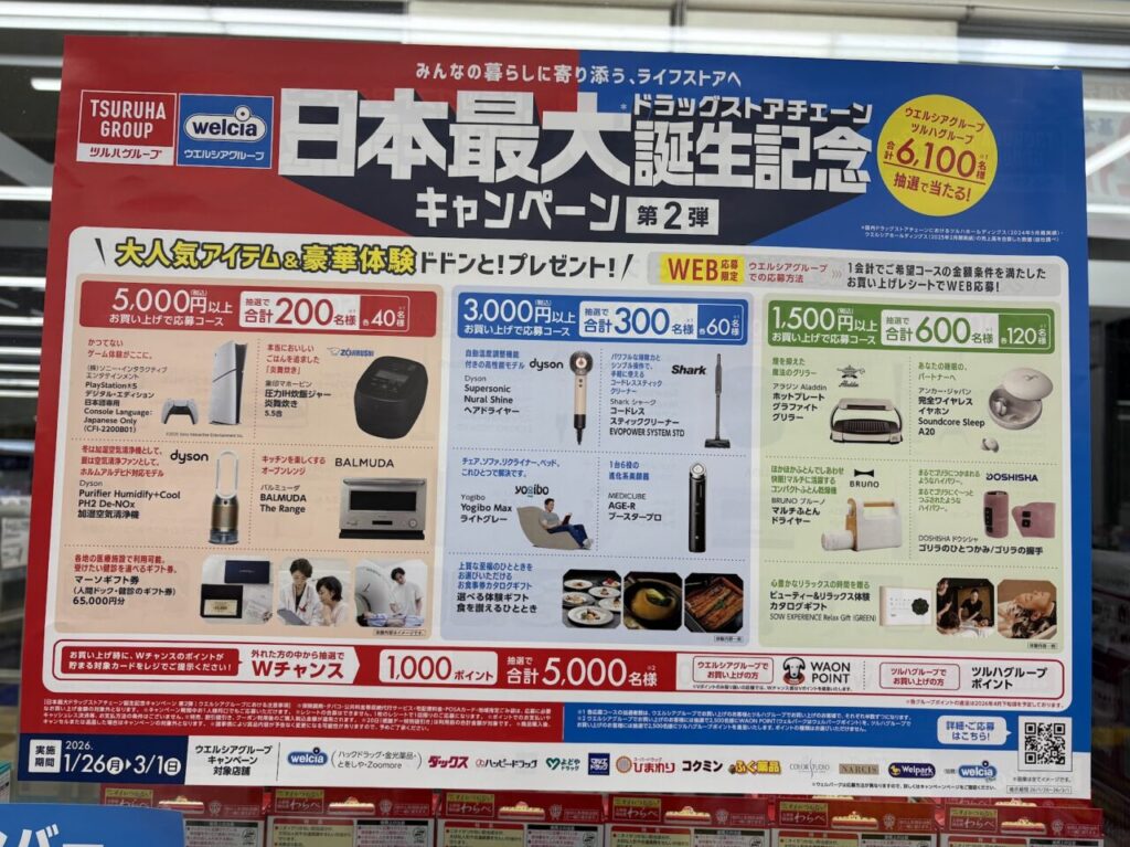 関連するチラシも近くに掲示されており見てみると、2026年1月26日(月)~3月1日(日)まで、キャンペーンを実施中とのことでした。どうやら昨年12月にツルハグループとウエルシアグループが経営統合した流れで実施されている企画のようです。