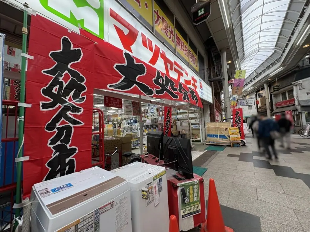 淡路本町商店街にある「マツヤデンキ淡路店」が閉店するとの情報があり、店舗の様子を見てきました。店前には「大処分市」の文字が目立つのぼりが設置されていました。