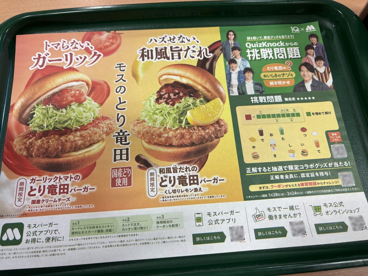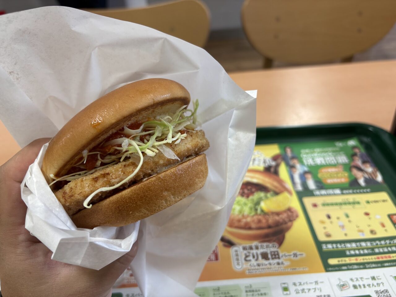 せっかく訪問したということで、期間限定メニューを食べてみることにしました。現在は、国産どりを使用した「モスのとり竜田」の2種類が販売されていました。3月中旬ごろまで販売予定ということで、改装後に訪れても食べられますね!