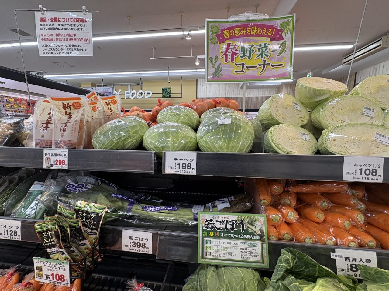野菜コーナーには春野菜が並ぶ棚もありました。中には大阪の八尾市の名産で、春を告げる野菜とも言われている「若ごぼう」があったりと、地元の春を感じられる商品も販売されていました。