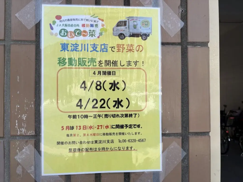 普段はJA大阪市平野支店にある直売施設「おいで~菜」の移動販売(出張販売)が、2026年4月は、8日(水)と22日(水)に開催されます。当日は10時から正午までの販売で売り切れ次第終了となります。